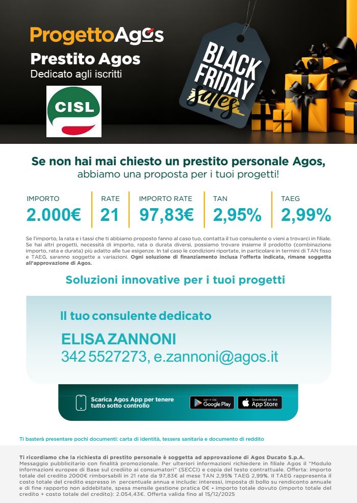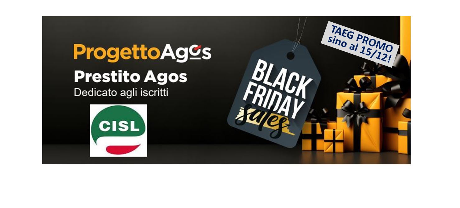 La nostra convenzionata AGOS ci segnala la nuova promozione "Black Friday" riservata agli iscritti CISL che non hanno mai richiesto un prestito personale AGOS.